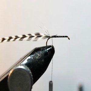 Surr hackle med jevne turn fremover og fest bak øyet, klipp fibrene over og under fluen slik at fibrene stikker kun ut til siden.